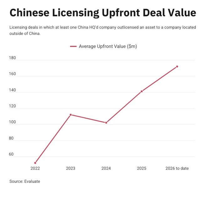 :2022 至 2026 年,中西药企间生物药授权交易预付款均值暴涨 230%,中国创新药资产在全球市场的定价已与国际接轨。从交易数量到单品价值,中